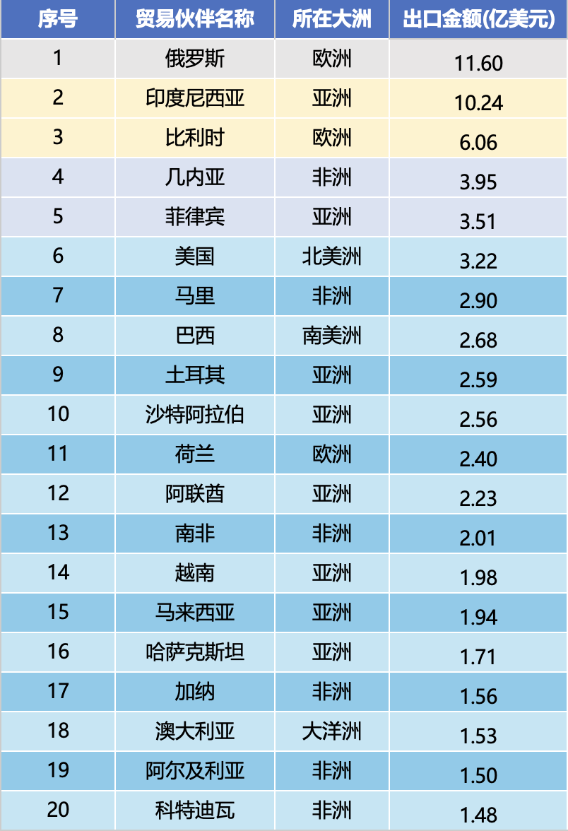Pagal regioninį pasiskirstymą geriausių partnerių dešimtukas apima penkis regionus: Europą (Rusija, Belgija), Aziją (Indonezija, Filipinai, Turkija, Saudo Arabija), Afriką (Gvinėja, Malis), Šiaurės Ameriką (JAV) ir Pietų Ameriką (Brazilija), iš kurių Azijos šalys sudaro 40 proc.; Sąrašo viršuje atsidūrė Rusija su 1,16 mlrd. JAV dolerių, tapusi didžiausia Kinijos ekskavatorių rinka užsienyje; Indonezija, kaip pagrindinė Azijos rinka, eksportavo daugiau nei 1 milijardą JAV dolerių, o tai rodo didelę paklausos mastą; Gvinėja ir Malis Afrikoje pateko į dešimtuką su dideliais pirkimais ir tapo pagrindiniais augimo poliais besivystančiose rinkose.