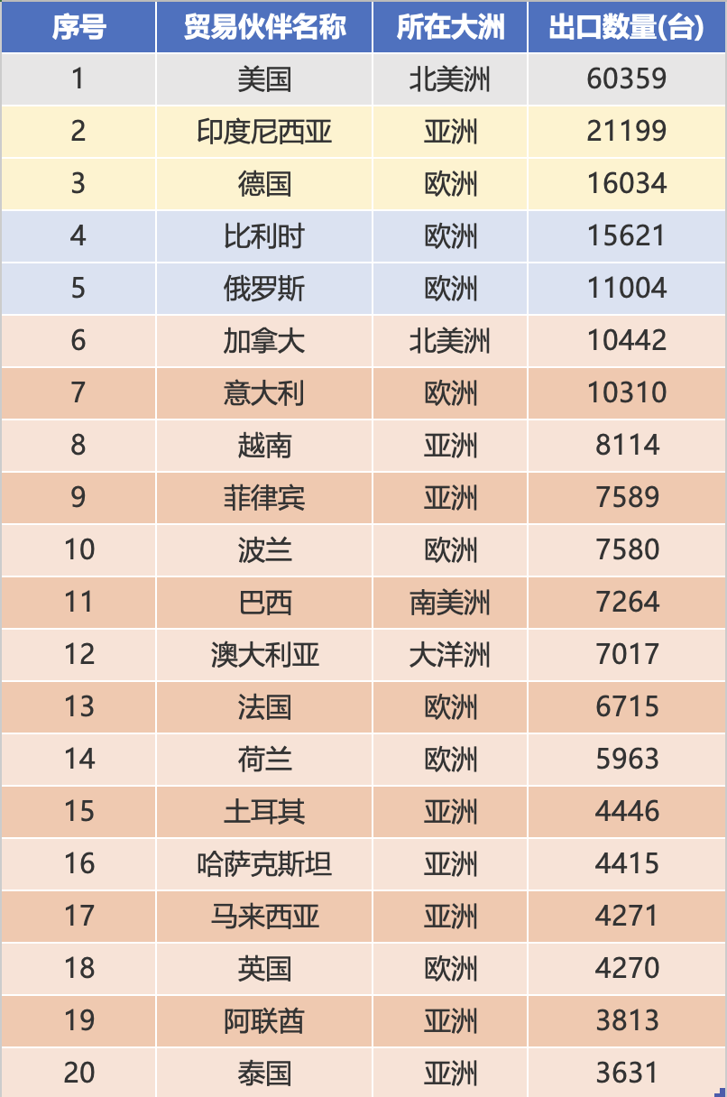Priešingai nei pagal sumos reitingą, Jungtinės Valstijos gerokai lenkia eksporto apimtį, viršijančią 60 000 vienetų, 2,8 karto daugiau nei antroje vietoje esančios Indonezijos, o vieneto kaina tik 5000 USD už vienetą, o tai pabrėžia jos ekonominės rinkos ypatybes; Europos rinkos rezultatai yra įspūdingi – Vokietija, Belgija, Rusija, Italija ir Lenkija patenka į dešimtuką, kurių bendras eksporto kiekis yra 61 000 vienetų, o tai sudaro 36,0% viso dešimties didžiausių rinkų, o tai atspindi didelę Kinijos ekskavatorių paklausą Europos rinkoje; Indonezija, Vietnamas ir Filipinai Azijoje išlaiko stabilų paklausos mastą, kurių bendras eksporto kiekis yra 37 000 vienetų, o tai tampa svarbia kiekio atrama.